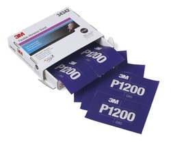 Compare Maximum number of 4 items selected 3M 1200 Grit Abrasive Hand Sheet - 34342 Part #: 34342 Line: MMM 3M 1200 Grit Abrasive Hand Sheet Manufacturer's Defect Warranty Color: Purple Grit: 1200 Grit Material: Film Quantity: 5 Type: Sheet Dimensions (in): 6-13/16 X 5-1/2 Inch Attachment Method: Hook And Loop Mineral Type: Aluminum Oxide Sanding Surface: Clearcoat Wet Or Dry: Dry, Wet Show More Show Less