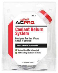 Compare Maximum number of 4 items selected A/C Pro Certified Coolant Recovery Tank - MCR3 Part #: MCR3 Line: INT A/C Pro Certified Coolant Recovery Tank 90 Day Limited Warranty Capacity: 1.5 Quart