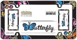 Compare Maximum number of 4 items selected Cruiser Accessories Butterfly License Plate Frame - 23053 Part #: 23053 Line: CSS Cruiser Accessories Butterfly License Plate Frame 1 Year Limited Warranty Color: Various Material: Plastic Theme: Butterfly Type: License Plate Frame Length (in): 6-11/16 Inch Length (mm): 169mm Width (in): 12-11/16 Inch Width (mm): 322mm Hardware Included: No Attachment Method: Bolt-On Cap Included: Yes Rust Resistant: Yes Locking Fasteners Included: No Show More Show Less