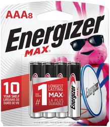 Compare Maximum number of 4 items selected Energizer MAX AAA Alkaline Battery Pack of 8 - E92MP-8 Part #: E92MP-8 Line: EVR Energizer MAX AAA Alkaline Battery Pack of 8 30 Day Limited Warranty Battery Type: Alkaline Quantity: 8 Type: Household Voltage (V): 1.5 Volt Battery Size: AAA Show More Show Less