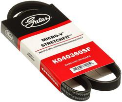 Compare Maximum number of 4 items selected Gates Stretch Fit Micro-V Serpentine Belt 4 Rib 36-9/16 Inch - K040360SF Part #: K040360SF Line: GAT Gates Stretch Fit Micro-V Serpentine Belt 4 Rib 36-9/16 Inch 3 Year Limited Warranty Number Of Ribs: 4 Top Width (in): 9/16 Inch Top Width (mm): 14mm Outside Length (in): 36-9/16 Inch Outside Length (mm): 930mm Belt Back Material: EPDM Rubber Show More Show Less