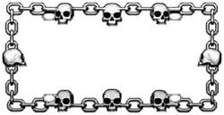 Compare Maximum number of 4 items selected Lethal Threat Chrome ABS Plastic Chain Skull Frame - PF99118 Part #: PF99118 Line: CTD Lethal Threat Chrome ABS Plastic Chain Skull Frame 1 Year Limited Warranty Color: Chrome Material: ABS Plastic Size: 12-1/4 X 6-1/2 X 1/2 Inch Weather Resistant: Yes Show More Show Less