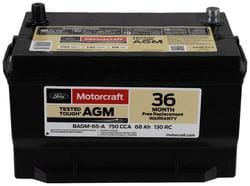 Compare Maximum number of 4 items selected Motorcraft Tested Tough MAX AGM Top Post Battery Group Size 65 65 750 CCA 120 Minute RC - BAGM65A Part #: BAGM65A Line: MOT Motorcraft Tested Tough MAX AGM Top Post Battery Group Size 65 65 750 CCA 120 Minute RC 3 Year Limited Warranty Battery Type: AGM Height (in): 7-9/16 Inch Height (mm): 192mm Length (in): 12-1/16 Inch Length (mm): 306mm Width (in): 7-9/16 Inch Width (mm): 192mm Terminal Type: Top Post Weight (Lbs): 45.36 Lbs. Voltage (V): 12 Volt Cold Cranking Amps (CCA): 750 CCA Cranking Amps (CA): 950 CA Group Size (BCI): 65 Reserve Capacity (min): 120 Minute Amp Hour (Ah): 70 Ah Positive Terminal Location: Top Left Group Size (DIN): 65 Add Acid And Charge Required: No Show More Show Less