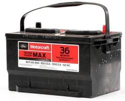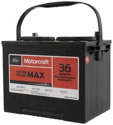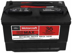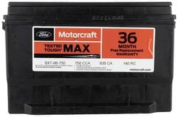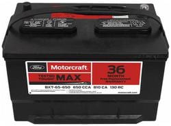 Compare Maximum number of 4 items selected Motorcraft Tested Tough MAX Standard Flooded Top Post Battery Group Size 65 850 CCA 150 Minute RC - BXT65-850 Part #: BXT65-850 Line: MOT Motorcraft Tested Tough MAX Standard Flooded Top Post Battery Group Size 65 850 CCA 150 Minute RC 3 Year Limited Warranty Battery Type: Standard Flooded Height (in): 7-5/8 Inch Length (in): 12 Inch Width (in): 7-1/2 Inch Terminal Type: Top Post Weight (Lbs): 46 Lbs. Voltage (V): 12 Volt Cold Cranking Amps (CCA): 850 CCA Cranking Amps (CA): 1000 CA Group Size (BCI): 65 Reserve Capacity (min): 150 Minute Positive Terminal Location: Top Right Flush Manifold Vent Cover: No Show More Show Less