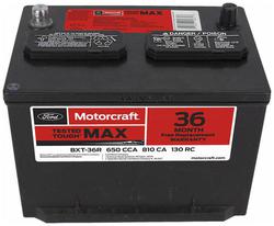 Compare Maximum number of 4 items selected Motorcraft Tested Tough MAX Standard Flooded Top Post Battery Group Size 36R 36R 650 CCA 130 Minute RC - BXT36R Part #: BXT36R Line: MOT Motorcraft Tested Tough MAX Standard Flooded Top Post Battery Group Size 36R 36R 650 CCA 130 Minute RC 3 Year Limited Warranty Battery Type: Standard Flooded Height (in): 8-1/8 Inch Height (mm): 206mm Length (in): 10-1/16 Inch Length (mm): 263mm Width (in): 7-3/16 Inch Width (mm): 183mm Terminal Type: Top Post Weight (Lbs): 39 Lbs. Voltage (V): 12 Volt Cold Cranking Amps (CCA): 650 CCA Cranking Amps (CA): 812.5 CA Group Size (BCI): 36R Reserve Capacity (min): 130 Minute Amp Hour (Ah): 58 Ah Positive Terminal Location: Top Right Group Size (DIN): 36R Add Acid And Charge Required: No Show More Show Less