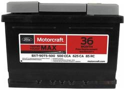 Compare Maximum number of 4 items selected Motorcraft Tested Tough MAX Standard Flooded Top Post Battery Group Size 90 90 500 CCA 85 Minute RC - BXT90T5500 Part #: BXT90T5500 Line: MOT Motorcraft Tested Tough MAX Standard Flooded Top Post Battery Group Size 90 90 500 CCA 85 Minute RC 3 Year Limited Warranty Battery Type: Standard Flooded Height (in): 6-15/16 Inch Height (mm): 175mm Length (in): 9-9/16 Inch Length (mm): 242mm Width (in): 6-15/16 Inch Width (mm): 175mm Terminal Type: Top Post Weight (Lbs): 30 Lbs. Voltage (V): 12 Volt Cold Cranking Amps (CCA): 500 CCA Cranking Amps (CA): 625 CA Group Size (BCI): 90 Reserve Capacity (min): 85 Minute Amp Hour (Ah): 48 Ah Positive Terminal Location: Top Right Group Size (DIN): 90 Add Acid And Charge Required: No Show More Show Less
