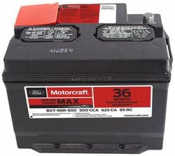 Compare Maximum number of 4 items selected Motorcraft Tested Tough MAX Standard Flooded Top Post Battery Group Size 96R 96R 500 CCA 85 Minute RC - BXT96R500 Part #: BXT96R500 Line: MOT Motorcraft Tested Tough MAX Standard Flooded Top Post Battery Group Size 96R 96R 500 CCA 85 Minute RC 3 Year Limited Warranty Battery Type: Standard Flooded Height (in): 6-5/16 Inch Height (mm): 175mm Length (in): 9-1/2 Inch Length (mm): 242mm Width (in): 6-5/16 Inch Width (mm): 175mm Terminal Type: Top Post Weight (Lbs): 30 Lbs. Voltage (V): 12 Volt Cold Cranking Amps (CCA): 500 CCA Cranking Amps (CA): 625 CA Group Size (BCI): 96R Reserve Capacity (min): 85 Minute Amp Hour (Ah): 48 Ah Positive Terminal Location: Top Right Group Size (DIN): 96R Add Acid And Charge Required: No Show More Show Less