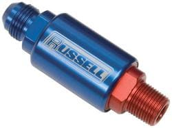 Compare Maximum number of 4 items selected Representative Image Russell -8AN X 3/8 Inch Fuel Filter - 650170 Part #: 650170 Line: RUS Russell -8AN X 3/8 Inch Fuel Filter 1 Year Limited Warranty Color: Blue, Red Fitting Size: -8AN X 3/8 Inch