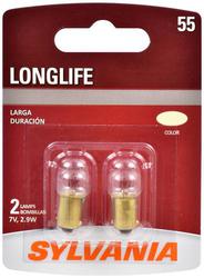 Compare Maximum number of 4 items selected SYLVANIA 55 Long Life Incandescent Mini Bulb (Pack of 2) - 55LLBP Part #: 55LLBP Line: SYL SYLVANIA 55 Long Life Incandescent Mini Bulb (Pack of 2) 1 Year Limited Warranty Bulb Family: G4 Color: Clear Voltage (V): 7 Volt Wattage (W): 2.9 Watt Amperage (A): 0.41 Amp Street Legal: Yes Number Of Filaments: 1 Bulb Type: Incandescent Light Center Length (in): 9/16 Inch Base Type: BA9s Bulb Color: White Industry Number: 55 Light Output (Lumens): 25 Lumen Color Temperature (Kelvin): 2800K Show More Show Less