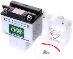 Compare Maximum number of 4 items selected Super Start PowerSports Battery Group Size B16A-AB - HCB16AAB Part #: HCB16AAB Line: SSB Super Start PowerSports Battery Group Size B16A-AB 3 month free replacement Battery Type: Standard Flooded Height (in): 7-1/8 Inch Height (mm): 181mm Length (in): 5-7/8 Inch Length (mm): 149mm Width (in): 3-9/16 Inch Width (mm): 91mm Terminal Type: Top Post Weight (Lbs): 11.7 Lbs. Voltage (V): 12 Volt Cold Cranking Amps (CCA): 210 CCA Group Size (BCI): B16A-AB Amp Hour (Ah): 16 Ah 10 Amp Hour Rate (Ah): 16 Ah Positive Terminal Location: Top Left Flush Manifold Vent Cover: Yes Add Acid And Charge Required: Yes Show More Show Less