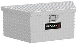 Compare Maximum number of 4 items selected TrailFX Single Lid Silver Tool Box - 201191 Part #: 201191 Line: TFX TrailFX Single Lid Silver Tool Box 90 Day Limited Warranty Color: Silver Finish: Polished Material: Aluminum Style: Trailer Tongue Box Height (in): 13 Inch Length (in): 34 Inch Width (in): 16 Inch Hardware Included: No Handle Type: Paddle Lockable: Yes Opening Type: Single Lid Surface Design: Diamond Tread Lid Shocks Included: Yes Show More Show Less