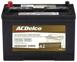 Compare ACDelco Standard Flooded Top Post Battery Group Size 27 750 CCA 135 Minute RC - 27GA Part #: 27GA Line: ACD ACDelco Standard Flooded Top Post Battery Group Size 27 750 CCA 135 Minute RC 42 MONTH LIMITED WARRANTY Battery Type: Standard Flooded Height (in): 8-11/16 Inch Height (mm): 221mm Length (in): 12 Inch Length (mm): 305mm Width (in): 6-7/8 Inch Width (mm): 174mm Terminal Type: Top Post Weight (Lbs): 49.9 Lbs. Voltage (V): 12 Volt Cold Cranking Amps (CCA): 750 CCA Cranking Amps (CA): 750 CA Group Size (BCI): 27 Reserve Capacity (min): 135 Minute Amp Hour (Ah): 75 Ah Positive Terminal Location: Top Left Show More Show Less