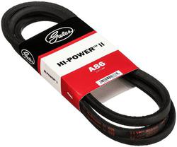 Compare Maximum number of 4 items selected Gates Hi-Power II V-Belt 1/2 Inch x 88 Inch - A86 Part #: A86 Line: GAT Gates Hi-Power II V-Belt 1/2 Inch x 88 Inch 1 Year Limited Warranty Top Width (in): 1/2 Inch Top Width (mm): 13mm Outside Length (in): 88 Inch Outside Length (mm): 2235mm Material: EPDM Rubber Notched: No Angle (Deg): 39 Degree Number Of Strands: 1 Section: A Belt Type: V-Belt Belt Back Material: Polyester Show More Show Less