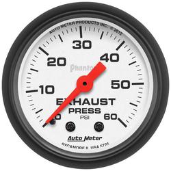 Compare Maximum number of 4 items selected Auto Meter Phantom 2-1/16 Inch Exhaust Pressure Gauge - 5726 Part #: 5726 Line: AUM Auto Meter Phantom 2-1/16 Inch Exhaust Pressure Gauge 1 Year Limited Warranty Gauge Size (in): 2-1/16 Inch Gauge Type: Exhaust Pressure Pointer Color: Fluorescent Red Bezel Color: Black Face Color: White Illumination Type: Incandescent Illumination Color: White Bezel Style: Super Bezel Gauge Size (mm): 52mm Movement Type: Mechanical Bezel Diameter (in): 2-1/4 Inch Show More Show Less