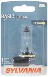 Compare Maximum number of 4 items selected SYLVANIA 896 Basic Halogen Fog Light Bulb (Pack of 1) - 896BP Part #: 896BP Line: SYL SYLVANIA 896 Basic Halogen Fog Light Bulb (Pack of 1) 1 Year Limited Warranty Industry Number: 896 Bulb Type: Halogen Wattage (W): 37.5 Watt Amperage (A): 2.93 Amp Voltage (V): 12.8 Volt Light Output (Lumens): 942 Lumen Bulb Family: T3 Color: Clear Street Legal: Yes Bulb Diameter (in): 3/8 Inch Number Of Filaments: 1 SAE/DOT Compliant: Yes Base Type: PGJ13 Bulb Color: White Color Temperature (Kelvin): 2800K Show More Show Less