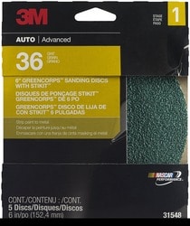 Compare 3M 6 Inch Diameter 36 Grit Abrasive Disc - 31548 Part #: 31548 Line: MMM 3M 6 Inch Diameter 36 Grit Abrasive Disc 1 Year Limited Warranty Color: Green Diameter (in): 6 Inch Diameter (mm): 152mm Grit: 36 Grit Material: Paper Quantity: 5 Type: Disc Attachment Method: Pressure Sensitive Adhesive (PSA) Mineral Type: Ceramic Aluminum Oxide Sanding Surface: Fiberglass, Filler, Metal, Paint, Rust Dust Free Design: No Sanding Method: Machine Wet Or Dry: Dry Show More Show Less