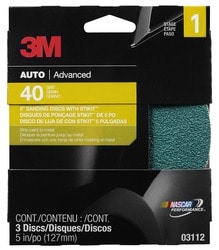 Compare 3M 5 Inch Diameter 40 Grit Sanding Disc - 3112 Part #: 3112 Line: MMM 3M 5 Inch Diameter 40 Grit Sanding Disc 1 Year Limited Warranty Color: Green Diameter (in): 5 Inch Grit: 40 Grit Material: Film Quantity: 3 Type: Disc Attachment Method: Pressure Sensitive Adhesive (PSA) Mineral Type: Aluminum Oxide Sanding Surface: Clearcoat, Fiberglass, Paint, Plastic, Primer Dust Free Design: No Sanding Method: Machine Wet Or Dry: Dry Show More Show Less