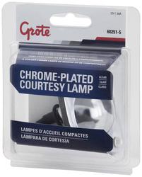 Compare Maximum number of 4 items selected Grote Light - 60251-5 Part #: 60251-5 Line: GRO Grote Light 1 Year Limited Warranty Wattage (W): 7.08 Watt Weatherproof: No Bulb Type: Incandescent Lens Color: Clear Finish: Chrome-Plated Light Color: Clear Type: Courtesy Attachment Method: Screw-On Voltage (V): 12 Volt Housing Material: Steel Amperage (A): 0.59 Amp Housing Shape: Round Show More Show Less