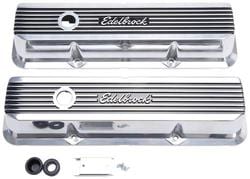 Compare Maximum number of 4 items selected Representative Image Edelbrock Valve Cover Set - 41859 Part #: 41859 Line: EDB Edelbrock Valve Cover Set 90 Day Limited Warranty Finish: Satin Material: Aluminum Style: Tall Oil Filler Cap Included: No Grommets Included: Yes Baffles Included: Yes Hold Down Tabs Included: No Show More Show Less